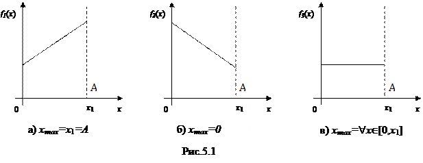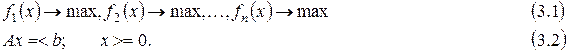 Посмотрим на самых простых примерах, к чему может привести постановка (3.1), (3.2). Возьмем одномерный случай и на рисунке изобразим возможные сочетания для трех критериев, полагая, что все критерии устремлены к максимуму (рис.5.1). Как мы видим из рисунка, математические схемы вполне соответствуют отмеченному выше содержательному смыслу: при одном и том же множестве ограничений Следовательно, многокритериальную задачу нужно решать, не добиваясь максимума или минимума для каждого функционала в отдельности, а построить «комплексную» целевую функцию, включающую частные функционалы: Различными авторами рассматривались способы выбора функций Поставим задачу линейного программирования с k-й целевой функцией (
