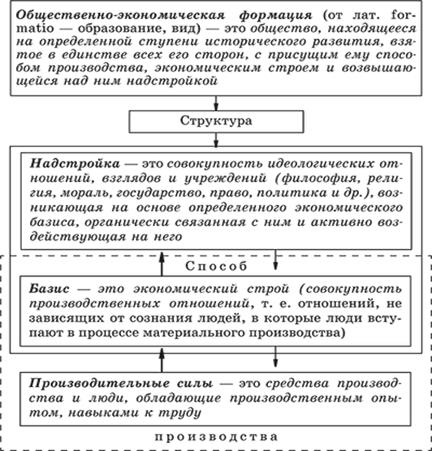 Несмотря на относительную самостоятельность, тип надстройки определяется характером базиса. Он же представляет собой основу формации, обусловливая принадлежность того или иного общества. Производительные силы являются динамичным, постоянно развивающимся элементом способа производства, тогда как производственные отношения статичны и косны, не меняются веками. На определенном этапе возникает конфликт между производительными силами и производственными отношениями, разрешающийся в ходе социальной революции, слома старого базиса и перехода на новую ступень общественного развития, к новой общественно-экономической формации. Старые производственные отношения заменяются новыми, которые открывают простор для развития производительных сил. Таким образом, марксизм понимает общественное развитие как закономерную, объективно обусловленную, естественно-историческую смену общественно-исторических формаций: