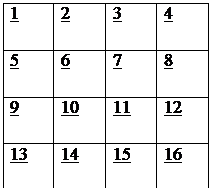 3. «Пятнашки» Исходные условия: На земле рисуется квадрат (он может быть разного размера, например 4x4, 5x5, и т.д., каждая клетка 40-50 см). В каждом квадрате нарисован номер от 1 до 16 или 25 (по кол-ву клеток). Группе выдаются карточки с цифрами от 1 до 15 или 24. Количество карточек на одну меньше чем количество клеток. Участники стоят в клетках хаотично. Задание: встать в клетку в соответствии с выданным номером. Ограничения: - участников расставляет мастер (ведущий) станции; - упражнение проводится в тишине; - участники должны переходить пошагово; - перемещение только вперед-назад или влево-вправо, наискосок переходить нельзя.