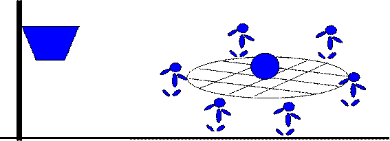 8. «Восход» Исходные условия: на ровной поверхности начерчен круг диаметром четыре метра. В центре круга находится мяч. Возле круга находятся палки (не менее пяти шт.) длинной два метра. Задание: поднять с помощью палок мяч на высоту более 1,5 метров и зафиксировать в течении 5 (10) секунд мяч. Ограничения: - в круг заступать нельзя; - касаться палкой земли запрещено; - при фиксации, мяча должны касаться все палки. Примечание для ведущего: при необходимости проводится в тишине.