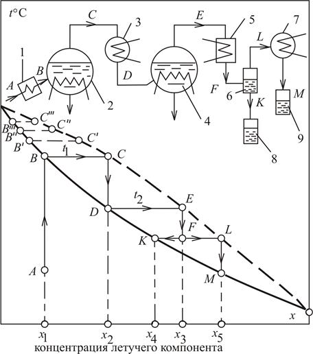Рис. 3.10. Схема двухступенчатой дистилляционной установки с дефлегмацией и сепарацией паров во второй ступени и ее процесс на t, x -диаграмме В дефлегматоре происходит частичная конденсация паров (линия ЕF), и получается влажный пар, соответствующий точке F. Влажный пар является смесью сухого пара с концентрацией, соответствующей точке L, и жидкости с концентрацией, соответствующей точке K. Затем влажный пар поступает в сепаратор 6, в сепараторе от пара отделяется жидкость. Жидкость с концентрацией x 4 < x 3 поступает в дистилляционный бак 8, а пары с концентрацией x 5 > x 3 направляются в конденсатор 7, где превращаются в дистиллят M, и из него поступают в бак готового продукта 9. В случае, когда дистилляция происходит в установке периодического действия, содержание летучего компонента в дистилляционном кубе 2 (рис. 3.10) постепенно уменьшается, причем дальнейшая перегонка как в кипящей жидкости, так и в получаемых из нее парах идет при переменной увеличивающейся температуре. Содержание низкокипящего компонента в жидкости в начале кипения и в последующие моменты времени определяется на кривой кипения точками Содержание летучего компонента в парах, все время уменьшаясь, становится равным его первоначальному содержанию в кипящей жидкости, а затем становится еще меньше (точка Перегонка с водяным паром [1] Когда смешаны две взаимонерастворимые жидкости, то каждая из них полностью сохраняет свои свойства. Такая смесь легко может быть разделена на составные части отстаиванием. В этом случае парциальное давление каждого компонента не зависит от его содержания в смеси и равно давлению паров чистого компонента при той же температуре, т.е. температура кипения не зависит от соотношения компонентов: