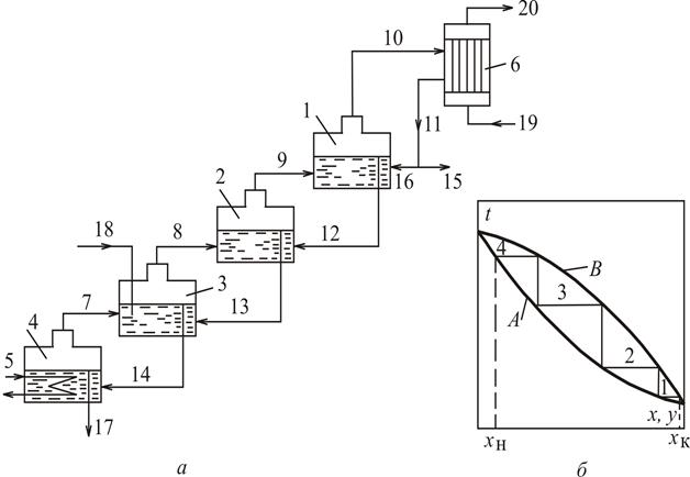 Рис. 3.13. Ректификация бинарной жидкой смеси: а – схема процессов: 1–4 – дистилляционные кубы; 5 – поверхность нагрева; 6 – дефлегматор; 7–10 – паровые потоки; 11–14 – перетоки жидкости; 15 – отвод дистиллята (целевого продукта); 16 – возврат части дистиллята обратно в первый куб; 17 – отвод кубового остатка; 18 – приток исходной смеси; 19–20 – вход и выход охлаждающей воды; б – диаграмма t – x, y процесса: 1–4 – теоретические тарелки; А – линия кипения; В – линия конденсации Пар конденсируют в специальном теплообменнике – конденсаторе или дефлегматоре 6 (рис. 3.13). Часть этого конденсата в виде флегмы идет на орошение колонны, другая часть – дистиллят или ректификат – отбирают как готовый продукт. Жидкость, выходящую из нижней части колонны, называют кубовым остатком. Для образования восходящих потоков паров устанавливается кипятильник 4, в котором происходит испарение части кубового остатка. Благодаря такому совмещению процессов конденсации и испарения отпадает надобность в конденсаторах и испарителях при каждом кубе; вся система обслуживается одним дефлегматором (конденсатором) (после верхнего куба) и одним испарителем (в самом нижнем кубе). В идеальном случае температуры жидкости и пара при их контакте в каждом кубе выравниваются, составы обеих фаз становятся равновесными, низкокипящий компонент (более летучий) диффундирует из жидкости в пар, а высококипящий – из пара в жидкость. Такой однократный контакт пара и жидкости, завершающийся достижением фазового равновесия, называется равновесной ступенью, или теоретической тарелкой. В примере (рис. 3.13) число теоретических тарелок равно числу последовательно соединенных дистилляционных кубов. На рис. 3.13, б изображены в диаграмме t – x, y изотермы, соответствующие отдельным теоретическим тарелкам. Рассмотренный процесс разделения жидкой смеси называется ректификацией. В технике каскад отдельных дистилляционных кубов заменяется барботажными, насадочными и пленочными колоннами. Для осуществления процесса ректификации колонны снабжаются внутренними или выносными дистилляционными кубами и конденсаторами (дефлегматорами). Схема ректификационной установки непрерывного действия с простой колонной представлена на рис. 3.14.