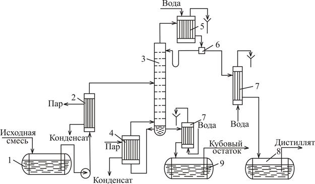 Рис. 3.14. Схема ректификационной установки непрерывного действия: 1 – емкость для исходной смеси; 2 – подогреватель; 3 – колонна; 4 – кипятильник; 5 – дефлегматор; 6 – делитель флегмы; 7 – холодильник; 8 – сборник дистиллята; 9 – сборник кубового остатка Ректификационная колонна 3 имеет цилиндрический корпус, внутри которого установлены контактные устройства в виде тарелок или насадки. Снизу вверх по колонне движутся пары, поступающие в нижнюю часть аппарата из кипятильника 4. Пары проходят через слой жидкости на тарелках снизу вверх и конденсируются в дефлегматоре 5. Получаемая жидкость разделяется на дистиллят и флегму, которая направляется на верхнюю тарелку колонны. С помощью дефлегматора в колонне создается нисходящий поток жидкости. Дистиллят охлаждается в холодильнике 7 и отводится в сборник верхнего продукта. Жидкость, поступающая на орошение колонны (флегма), представляет собой почти чистый НК – низкокипящий компонент. Однако, стекая по колонне и взаимодействуя с паром, жидкость все более обогащается высококипящим компонентом (ВК), конденсирующимся из пара. Часть жидкости поступает в кипятильник 4, обогреваемый глухим паром или другим теплоносителями, а другая часть отводится из колонны в виде кубового остатка (нижнего продукта). В качестве хладагентов в дефлегматоре и холодильнике 7, кроме воды, могут использоваться и другие хладагенты. Например, при низкотемпературной ректификации – сжиженный этилен. Для непрерывного проведения ректификации необходимо, чтобы поступающая на разделение смесь соприкасалась со встречным потоком пара с несколько большей концентрацией ВК, чем в жидкой смеси. Поэтому исходную смесь подают в то место ректификационной колонны 3, которое соответствует этому условию. Место ввода исходной смеси, нагретой до температуры кипения в подогревателе 2, называют тарелкой питания, или питательной тарелкой. Положение тарелки питания или ввода исходной смеси специально рассчитывается. Тарелка питания делит колонну на две части: верхнюю – укрепляющую и нижнюю – исчерпывающую. В укрепляющей части происходит обогащение поднимающихся паров низкокипящих компонентом, а в исчерпывающей – удаление НК. 54. Электроэнергетика - важнейшая фундаментальная отрасль, обеспечивающая нормальную деятельность всех других отраслей экономики, функционирование социальных структур и необходимые условия жизни населения. Ни одно предприятие, будь то маленькая фабрика или крупный промышленный комплекс, не смогут выполнять свои технологические функции и быть работоспособными без бесперебойного и качественного электроснабжения, надлежащих санитарно-гигиенических условий и обеспечения охраны труда. Поэтому электроэнергетическая служба предприятия (организации) должна быть укомплектована необходимым количеством специалистов, способных профессионально решать эти важные и многофункциональные задачи. Нельзя согласиться с мнением тех руководителей и специалистов, которые недооценивают электроэнергетическое хозяйство своих предприятий (организаций) и считают его вспомогательным производством, допуская недокомплектацию штатной численности персонала энергослужбы, иногда вплоть до ликвидации должности главного энергетика, а также уделяют недостаточно внимания организации обучения, переподготовки и про
