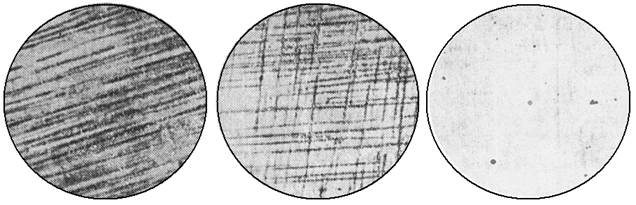 а б в Рис. 1. Различная степень готовности микрошлифа: а – подготовлен к более тонкой шлифовке; б – требуется продолжение шлифовки на данном абразиве; в – состояние поверхности микрошлифа после полировки