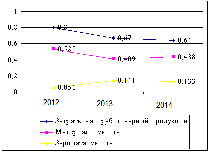 Анализ динамики относительных показателей затрат показал, что затраты на 1 тыс.руб. товарной продукции превышают в целом общую сумму материалоемкости и зарплатоемкости, поскольку они являются ее составными элементами (рис. 2).