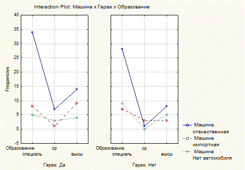 Наличие гаража особо не влияет на наличие машины у людей с различным образованием. Единственное, люди со специальным образованием гораздо чаще имеют машину (отечественной марки), чем с любым другим образованием. Также можно отметить, что в среднем машин больше у тех, кто имеет гараж (если не брать в расчет иномарки) - это можно проследить по людям с высшим и специальным образованием. Замечание. Вывод основан только на графической иллюстрации, нет аналитического подтверждения при помощи таблицы с результатами критериев Пирсона, наибольшего правдоподобия, непараметрических коэффициентов корреляции. Дисперсионный анализ (Anova)
