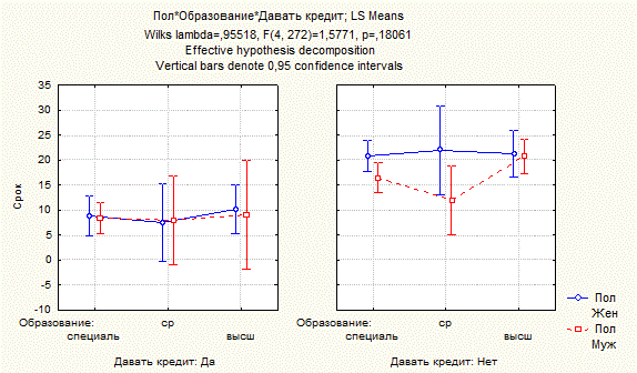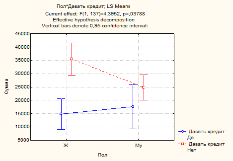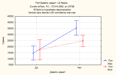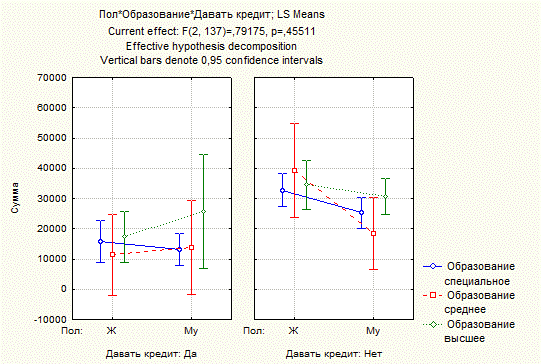 Кредиты на большие суммы выдавались только мужчинам с высшим образованием. Замечание. Все выводы основаны только на графической иллюстрации, нет аналитического подтверждения при помощи таблицы с результатами применения апостериорных методов (Тьюки, Бонферони, Фишера и т.д.).