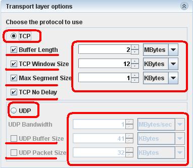 В меню Transport layer options можно выбрать настройки либо протокола TCP либо протокола UDP. Можно задать размер буфера, размер окна, максимальный размер сегмента и т.п.