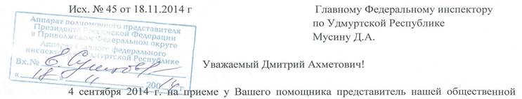 организации Шишкина Ирина Сергеевна изложила суть проблемы сложившейся в городе Ижевске в связи с незаконным размещением автостоянок во дворах многоквартирных жилых домов, а также вокруг детских дошкольных учреждений и школ. При этом она указала на основные причины этой проблемы, которыми являются: - нежелание муниципальной власти работать в этом направлении; - отсутствие государственного экологического и санитарного контроля; - отказ органов МВД выполнять свои функции по обеспечению правопорядка на территориях городских дворов; - нежелание прокуратуры УР выполнять свои должностные обязанности. Кроме личного приема, на Ваше имя было направлено обращение с приложениями, доказывающими бездействие названных выше государственных органов. Вполне естественно, что мы ожидали с Вашей стороны каких-то мер, в результате которых перечисленные государственные органы начнут хотя бы частично выполнять свои обязанности по устранению нарушений федерального законодательства, ущемляющих конституционные права граждан. Однако вместо этого для нас была организована встреча с главой муниципального образования Ушаковым А.А. в Вашей приемной. Поскольку в своем обращении к Вам мы указывали на бездействие городской власти и неоднократно обращались к этому должностному лицу, то ничего кроме недоумения такая встреча у нас не вызвала. Тем более что в обращении мы выделили главную тему для обсуждения - отсутствие государственного контроля и прокурорского надзора, что не входит в компетенцию главы муниципального образования. Видимо почувствовав наше недоумение и неудовлетворение происходящим, Ваш помощник предложил нам проявить инициативу по созданию под Вашим патронажем какой-то рабочей группы. В каком составе и для чего нужна эта рабочая группа мы так и не поняли, но посоветовавшись, решили обратиться к Вам с предложением, провести обсуждение данной проблемы с депутатами Государственной Думы РФ от Удмуртии, прокурором республики, представителями руководства МВД, руководителями Роспотребнадзора по УР, Росприроднадзора по УР и Министерства природных ресурсов и охраны окружающей среды УР. Результатом такой встречи должен стать письменный ответ всех названных руководителей, что им мешает исполнять соответствующие обязанности по защите нашего Конституционного права на благоприятную среду обитания (жизнедеятельности) и как они видят своё участие в решении проблемы незаконного размещения автотранспорта во дворах многоквартирных жилых домов и на территориях, примыкающих к детским дошкольным учреждениям и школам.