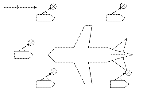 Производится аварийная посадка транспортного самолета ИЛ-86. Длина фюзеляжа 56 м, а его диаметр 6 м. Аэропорт 8-й категории. В боевом расчете имеется: 2 АА-40 (131)139; АА-60 (43105)189; 2 АА-60 (7310)160-01. Определить: - требуемое количество сил и средств для тушения разлитого топлива под самолетом; - организовать тушение и начертить схему расстановки сил и средств (ветер с носу самолета). Решение Определяем площадь практической критической зоны: Sкр п=0,7х lсам(30+d), где lсам=56 метров, d=6 метров Sкр п=0,7х 56 (30+6)=1411,2 м2; Определяем требуемый расход раствора ПО: Qр-ра тр= Sкр п х Iн=1411,2 х 0,137=193,3 л/с; Определяем необходимый объем раствора ПО: Vр-ра тр= Qр-ра тр х Тр=193,3 х 3 х 60= 34794 л. ,при тушении разлитого авиатоплива в первую очередь для недопущения распространения пожара на фюзеляж самолета и шасси применяют стационарные лафетные стволы ПА. На вооружении данного аэропорта имеется: АА-40(131)139, с запасом 150 л. ПО; АА- 60(43105)189, с запасом 250 л. ПО; АА- 60(7310)160-01, с запасом 900 л. ПО; Общий объем вывозимого ПО будет равен 2350 литров. Определим требуемый запас ПО для тушения пожара: Vпо= Vр-ра х С= 34794 х 0,06= 2087,64 литров. Схема расстановки сил и средств при пожаре