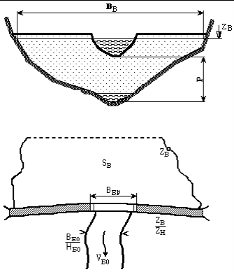 Таблица характеристик створа ГТС заполнена с использованием карты местности и пояснительной записки к объекту реконструкции. В таблице и на рисунках: Wв - объем водохранилища при нормальном подпорном уровне водохранилища (НПУ), млн.м3; Hв - глубина водохранилища у плотины при НПУ, м; Sв - площадь зеркала водохранилища при НПУ, млн.м2; Bв - ширина водохранилища у плотины при НПУ, м; Hбо - глубина реки в нижнем бьефе гидроузла, м; Bбо - ширина реки в нижнем бьефе гидроузла, м; Vбо - скорость течения в нижнем бьефе гидроузла, м/с; Hp - глубина водохранилища у плотины на момент разрушения гидроузла (м), зависит от наполнения водохранилища. Ep - степень разрушения гидроузла, изменяется от 0 до 1 (мин-макс), вычисляется по формуле: Ep = Fбреши / Fсечения плотины p - высота порога бреши, м, определяется относительно дна водохранилища у ГТС, диапазон - от 0 до Hв (м); Zв - отметка уреза воды водохранилища при НПУ (м), то есть, отметка над уровнем моря; N - количество постоянных створов по длине реки.