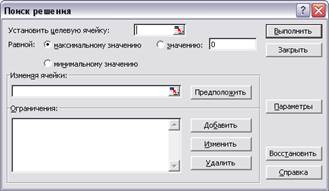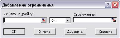 В поле Установить целевую ячейку нужно указать ссылку на ячейку с целевой функцией. Если перед вызовом инструмента Поиск решения выделить ячейку с целевой функцией (рекомендуется), то это поле уже будет заполнено. Ниже расположены элементы управления - переключатели, - позволяющие задать, какое значение целевой функции должно быть достигнуто при решении задачи: минимальное, максимальное или некоторое конкретное значение. Поле Изменяя ячейки позволяет задать диапазон, в котором располагаются неизвестные величины, влияющие на целевую функцию. Список Ограничения представляет все ограничения, накладываемые кнопкой Добавить. На экране появится диалоговое окно: