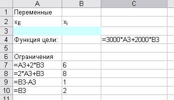 Изучение рынка сбыта показало, что суточный спрос на краску I никогда не превышает спроса на краску Е более, чем на 1т. Кроме того, установлено, что спрос на краску I никогда не превышает 2т в сутки. Оптовые цены одной тонны красок равны: Е=3000 руб., I=2000 руб. Какое количество краски каждого вида должна производить фабрика, чтобы доход от реализации продукции был максимальным? Для решения этой задачи необходимо построить математическую модель. Процесс построения модели можно начать с ответа на следующие три вопроса: 1. Для определения каких величин строится модель (т.е. каковы переменные модели)? 2. В чем состоит цель, для достижения которой из множества всех допустимых значений переменных выбираются оптимальные? 3. Каким условиям должны удовлетворять неизвестные? В нашем случае фабрике необходимо спланировать объем производства красок так, чтобы максимизировать прибыль. Поэтому переменными являются xi –суточный объем производства краски I, xE – суточный объем производства краски Е. Суммарная суточная прибыль от производства xi краски I и xE краски Е равна z= 3000 xE +2000 xi.Целью фабрики является определение среди всех допустимых значений xE и xi таких, которые максимизируют суммарную прибыль, т.е. целевую функцию z. Ограничения, которые налагаются на xE и xi. Объем производства красок не должен быть отрицательным, следовательно: xE,xi ≥0. Расход исходного продукта на производство обоих видов красок не может превосходить максимально возможный запас данного исходного продукта, следовательно: xE +2xi ≤6 2xE +xi ≤8 Кроме того, ограничения на величину спроса на краски таковы: xi - xE ≤1 xi ≤2. Таким образом, математическая модель данной задачи имеет следующий вид: Максимизировать: z= 3000 xE +2000 xi При следующих ограничениях: xE +2xi ≤6 2xE +xi ≤8 xi - xE ≤1 xi ≤2 xE,xi ≥0. Данная модель является линейной, т.к. целевая функция и ограничения линейно зависят от переменных. Создадим таблицу и внесем в нее сформулированную модель и соответствующие данные.