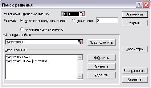 Выберем команду Сервис \ Поиск решения и заполним открывшееся диалоговое окно.