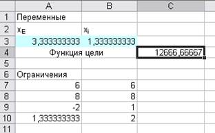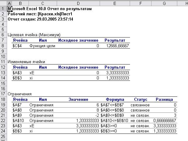 Результаты расчета нашей задачи (оптимальный план производства и соответствующая прибыль) представлены ниже. Из таблицы видно, что оптимальным является производство 3, 33 т краски Е и 1,33 т краски I в сутки. Этот объем производства принесет фабрике 12 667, 67 руб. прибыли.