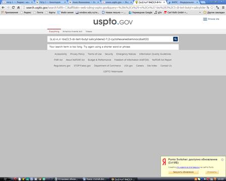 Вывод: Было использовано 4 базы данных (БД): http://sci-hub.org/, http://www.sciencedirect.com, http://www.springenlink.com, web of science для поиска статей на тему «new jacobsens catalyst», также вводились «chiral Co(II) salen complex» и «(s,s)-n,n'-bis(3,5-di-tert-butyl salicylidene) -1,2-cyclohexanediaminocobalt(II)» с исполь- зованием логических операторов or,and,«». Более удобная база данных:http://sci-hub.org/. Так как много статей, которые находятся в свободном доступе. Был проведен научный поиск в 2 патентных БД. Но ни в одной БД не было той информации, которая была неоходима. На www.uspto.gov были представлены результаты, но они не касались моей темы.