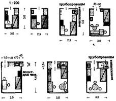 Номера гостиниц. Высота помещений по нормам не менее 2,8 м. Общие номера проектируются из расчета не менее 3 м2 и 12 м3 на одно место, а одноместные номера — 6 —8 м2 и 18 —20 м3 на место. Умывальник располагается в углу номера, у перегородки и по возможности вблизи водопроводного стояка, к которому возможен доступ из коридора. Для повышения звукоизоляции между коридором и номером устраивают двойные двери, встроенные стенные шкафы, иногда— встроенные умывальники, душевые кабины, раздельные или совмещенные санузлы с ванной и унитазом. Ванны при номерах теперь устанавливают почти повсеместно, особенно в двухкомнатных номерах. В передней или шлюзе устраивают вешалки для верхней одежды. Глубина шкафов для одежды в ФРГ большей частью равна 0,6 м, в США преимущественно устраиваются шкафы-гардеробы с нишей для одевания. Окна располагают не по оси номера, а несколько сдвинув от оси в сторону, благодаря чему изголовье кровати находится не под окном. Перед окнами по возможности оставляют свободное место для удобства открывания и обзора. В двухкомнатных номерах за счет части площади гостиной возможно устройство лоджии. Многокомнатные номера целесообразно размещать в угловых частях здания. В двухместных номерах кровати ставят одну за другой вдоль поперечной перегородки; в просторных двухместных номерах кровати ставят перпендикулярно стене. Мебель в номере: кровать размером 0,9 х 1,95 м (иногда откидная), в небольших номерах служит также и в качестве дивана; шкаф для платья, белья, шляп и обуви, а также для грязного белья глубиной 60 см, шириной 50 см; оптимальная ширина 75 —100 см; ночной столик размером 40 х 40 см, 2 кресла и диван, 1 стол, подставка для чемоданов 50 х 80 см высотой 40 см, скамеечка для снимания сапог, умывальник, позади зеркала — шкафчики для медикаментов, вешалка для полотенец.