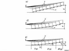 В зрелищных помещениях массового пользования головы впереди сидящих зрителей являются основным препятствием для зрительных лучей. Улучшение видимости в удаленных от сцены или эстрады местах зала достигается повышением уровня сцены (эстрады) и наклонным расположением зрительских мест. Для беспрепятственной видимости выбранной точки (объекта) необходимо обеспечить условие, при котором зрительный луч (отрезок прямой, проведенный к ней от глаза наблюдателя) проходит на высоте с = 12... 15 см над уровнем глаза впереди сидящего зрителя*-для крытых и открытых спортивных сооружений, 6... 8 см - для театров, концертных залов и кинотеатров (как правило, для уменьшения высоты подъема рядов зрительских мест). Беспрепятственная видимость достигается при размещении зрительских мест по трем следующим видам поверхностей: 1) прямолинейной наклонной (рис. 9.5, а), где высота подступенка г для всех рядов зрительских мест будет одинаковой. Вместе с тем превышение зрительного луча с станет переменным, увеличиваясь от последнего ряда к первому, создавая значительный экономически неоправданный высотный перепад мест в зрительном зале; 2) криволинейной, создающей наименьший подъем мест при сохранении постоянства превьппения зрительного луча с, однако величина подступенка г будет переменной, что нарушает унификацию размеров (рис. 9.5, б); 3) ломаной, предусматривающей устранение трудностей и противоречий между идеальным и реальным профилем зрительских мест