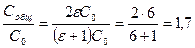 Решение: После того как между обкладками конденсатора поместили диэлектрическую пластинку, его можно рассматривать как батарею последовательно соединенных конденсаторов: первый – заполненный диэлектриком с емкостью Общая емкость батареи определится правилом последовательного соединения конденсаторов: Емкости С 1 и С 2 можно выразить через первоначальную емкость плоского воздушного конденсатора Отсюда общая емкость батареи будет равна: Подставляя значение ε = 6, получаем ответ