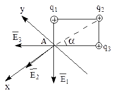 Пример 3. В трех вершинах квадрата со стороной a = 40 см находятся одинаковые положительные заряды по q 1 = q 2 = q 3 = 5·10-9 Кл каждый. Найти напряженность E поля в четвертой вершине. Решение: По принципу суперпозиции электрических полей (рис. 20) для точки А находим: