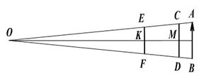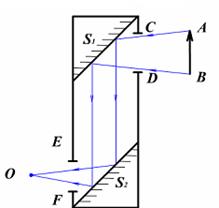 Пример 1. На рисунке приведена схема перископа, который содержит два зеркала S 1 и S 2 , установленные под углом 450 к трубе перископа (рис. 48). Лучи света от предмета AB через верхнее отверстие трубы перископа CD попадают на зеркало S 1 , отражаются от него и, пройдя по трубе, попадают на зеркало S 2 . Отразившись от зеркала S 2, свет через нижнее отверстие трубы EF попадает в глаз наблюдателя (точка O). Определить наименьшую ширину h верхнего отверстия перископа, позволяющего наблюдать во весь рост человека высотой H, стоящего от перископа на расстоянии L, если расстояние между зеркалами по вертикали равно L1 . Решение: Выберем два крайних луча AC и BD, лежащие в плоскости чертежа. Поскольку плоскости зеркал перпендикулярны к плоскости чертежа, то после отражения лучи AC и BD также останутся в плоскости чертежа (рис. 49). Заметим, что после второго отражения луч возвращается к своему первоначальному направлению. Поэтому лучи AC и BD можно изобразить в виде прямых, сходящихся в точке O. Отрезок AB – высота H рассматриваемого человека, CD и EF – размеры соответственно верхнего и нижнего отверстий перископа. В треугольнике OAB проведем высоту OM. Из подобия треугольников OAB и OСD следует, что Согласно условию задачи, AB = H, CD = h, KM = L. Так как расстоянием от нижнего отверстия до глаза можно пренебречь, то