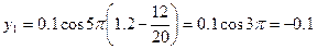 где А = 0,1 м, ω = 5π с-1, υ = 20 м/с. Чтобы найти смещение y указанных точек, достаточно в уравнение (2) подставить значения t и х: