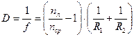 где f – фокусное расстояние линзы; n л – абсолютный показатель преломления вещества линзы; n ср – абсолютный показатель преломления окружающей среды. Радиусы R 1 и R 2 выпуклых поверхностей берутся со знаком плюс, вогнутых – со знаком минус. Оптическая сила двух тонких сложенных вплотную линз