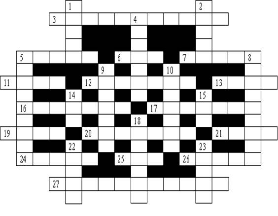 По горизонтали: 3. Явление, происходящее со светом при его прохождении через кристалл турмалина. 5. Элементарная частица, квант электромагнитного излучения. 6. Результат отражения звуковых волн. 7. Отрицательный электрод, испускающий электроны. 11. Микрочастица, название которой по-гречески означает «неделимый». 12. Физическая величина, показывающая, какую работу может совершить тело. 13. Собственный момент импульса элементарной частицы. 16. Функция динамометра. 17. Основная единица измерения времени. 19. Электрическая система, состоящая из источников и приемников тока, замыкающих устройств и проводников. 20. Явление сохранения скорости тела при отсутствии действия на него других тел.21. Совокупность капелек воды, образовавшихся в камере Вильсона по пути пролета элементарной частицы. 24. Общее название представителя группы элементарных частиц, участвующих в сильных взаимодействиях. 25. Английский ученый, первым объяснивший интерференцию света. 26. Ученый, экспериментально открывший закон, согласно которому произведение давления газа на его объем постоянно при неименной температуре. 27. Электровакуумный прибор, действие которого основано на явлении внешнего фотоэффекта. По вертикали: 1. Выходное отверстие реактивного двигателя. 2. Основной элемент оптических систем, собирающий или рассеивающий световые лучи. 4. Прямая, изображающая зависимость давления газа от температуры при постоянном объеме. 5. Ярко светящаяся поверхность Солнца. 8. Машина, преобразующая какой либо вид энергии в механическую работу. 9. Устройство для излучения или получения радиоволн. 10. Процесс парообразования, происходящий по всему объему жидкости. 14. Время обращения планеты вокруг солнца. 15. Линия, вдоль которой распространяется поток световой энергии. 18. Французский физик, разработавший теорию дифракции света. 22. Вращающаяся часть электрических машин. 23. Возмущение, распространяющееся в какой-либо среде или пространстве с течением времени.