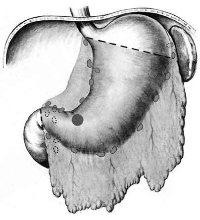 Рис. 66. Субтотальная проксимальная резекция желудка. Объем операции.