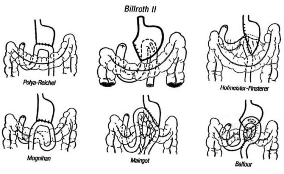 Рис. 70. Основные виды эзофагоеюноанастомоза (схема). а – горизонтальный пищеводно‑кишечный анастомоз; б – анастомоз по Мак‑Ниру и Пэку; в – анастомоз по Сапожникову‑Юдину; г – анастомоз по Гиляровичу; д – анастомоз по Орру‑Ханту‑Накаяме; е – анастомоз по Цианиди По мнению Б. Е. Петерсона (1970), субтотальной резекцией желудка считается та операция, при которой удаляют всю малую кривизну желудка от пищевода, а по большой кривизне отсечение органа может проводиться на разных уровнях в зависимости от локализации опухоли и метастазирования в регионарные лимфатические узлы. Большинство авторов рекомендуют отсекать желудок по большой кривизне на уровне нижнего полюса селезенки. А. И. Раковым более 50 лет назад предложена рациональная методика субтотальной дистальной резекции желудка, включающая в себя полное иссечение печеночно‑желудочной связки от пищевода и пересечение левой желудочной артерии у места ее отхождения от чревной (у основания) в толще желудочно‑поджелудочной связки, а также удаление в препарате всего большого сальника. Показанием к субтотальной дистальной резекции желудка является экзофитный рак нижней трети желудка. По строгим показаниям выполнение этой операции допускается при небольших эндофитных или смешанной формы роста опухолях пилороантрального отдела, или когда маленькая экзофитная опухоль локализуется в средней трети желудка. Операцию завершают формированием гастродуоденального или гастроеюнального анастомоза. Чаще применяют методику Бильрот‑II на длинной петле (по Баль‑ФУРУ) с энтеро‑энтероанастомозом между приводящей и отводящей петлями по Брауну с целью профилактики рефлюкс‑гастрита, или на короткой петле (по Гофмейстеру‑Финстереру). Некоторые хирурги отдают предпочтение гастроеюнальному анастомозу на выключенной по Ру петле тонкой кишки. В настоящее время продолжается поиск новых хирургических подходов, позволяющих надеяться на улучшение отдаленных результатов лечения. Одним из путей решения данной проблемы является повышение онкологического радикализма и резектабельности за счет выполнения комбинированных (при прорастании опухоли в соседние органы) и расширенных оперативных вмешательств. Противопоказанием к радикальному хирургическому лечению рака желудка является IV стадия заболевания. Нередко при этом можно выявить асцит, желтуху и множественные метастазы в обеих долях печени (генерализация опухолевого процесса). Паллиативные вмешательства при раке желудка имеют важное значение и они направлены на ликвидацию ряда осложнений, значительно отягчающих состояние пациентов, а если они пробные, то оказывают положительное психическое влияние на больного. Эти операции существенным образом не продлевают жизнь больных, но временно улучшают качество жизни и общее состояние. При раке желудка выполняют три основных типа паллиативных вмешательств: паллиативную резекцию, формирование обходных анастомозов и питательных свищей (гастростом). Паллиативную резекцию желудка выполняют по жизненным показаниям, например, при продолжающемся кровотечении из опухоли, перфорацию опухоли, которую технически невозможно ушить. Выполняют эту операцию при относительно небольших, «подвижных» опухолях в основном выходного отдела желудка по той же методике, что и радикальную, но при 