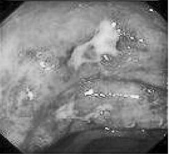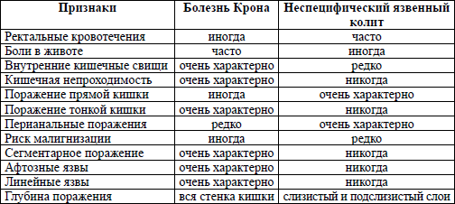 Рис. 177. Эндоскопическая картина при болезни Крона. Болезнь Крона необходимо дифференцировать от многих заболеваний. Гранулематозное поражение тонкой кишки часто диагностируется как аппендикулярный абсцесс или острый аппендицит, так как дифференцировать их крайне трудно. Иногда невозможно отличить болезнь Крона от воспаления в дивертикуле Меккеля и других острых заболеваний брюшной полости. Наиболее сложна дифференциальная диагностика болезни Крона и неспецифического язвенного колита, от которого она отличается отсутствием поражения прямой кишки в 50 % случаев, более глубокими язвами толстой кишки, асимметричностью и прерывистостью процесса, тенденцией к формированию стриктур и свищей. Основные дифференциальнодиагностические критерии язвенного колита и болезни Крона отражены в таблице 1 (Г. И. Воробьев, 2001, с изменениями). Лечение Принципы консервативного и противорецидивного лечения болезни Крона включают в себя противовоспалительную, гормональную, симптоматическую терапию. Комплексная терапия назначается на фоне специальной щадящей диеты с исключением цельного молока, фруктов и овощей, включением нежирного мяса и рыбы. Основными медикаментами являются салазопрепараты – сульфасалазин, месалазин, салофальк и другие. Широко применяются кортикостероиды, они, как правило, высокоэффективны как при системном, так и при местном применении. Однако необходимо отметить, что применение гормональной терапии уменьшает клинические проявления заболевания, но не улучшает гистологическую и эндоскопическую картину заболевания. У пациентов с повышенной психологической возбудимостью целесообразно назначение седативных препаратов. Хирургическое лечение болезни Крона, в отличие от язвенного колита, не носит радикальный характер, так как гранулематозное воспаление может развиваться в любом отделе желудочно‑кишечного тракта. Целями хирургического лечения при болезни Крона являются борьба с осложнениями и улучшение качества жизни пациентов, когда этого невозможно достичь медикаментозными средствами. Независимо от характера течения болезни Крона примерно у 60 % пациентов в связи с развитием осложнений возникает необходимость в оперативном лечении, особенно в случаях поражения толстой и подвздошной кишки. Неэффективные кортикостероидная и иммуносупрессивная терапия, даже при отсутствии осложнений, также являются показанием к операции – резекции пораженного участка. Однако нет никакой гарантии, что после операции не возникнет рецидив в зоне анастомоза или в любом другом месте ЖКТ, так как естественное течение болезни Крона не прерывается и после хирургического вмешательства. Частота послеоперационных рецидивов составляет 20–40 % в течение 5 лет после резекции, как минимум каждый третий больной нуждается в повторной операции.