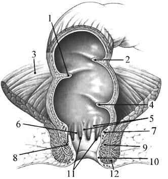 Рис. 193. Анатомия прямой кишки. 1 – средняя поперечная складка (valvula Houstoni); 2 – верхняя поперечная складка (valvula Houstoni); 3 – мышца, поднимающая задний проход (m. levator ani); 4 – нижняя поперечная складка (valvula Houstoni); 5 – заднепроходные (анальные) столбы (Morgani); 6 –зубчатая линия; 7 – внутреннее геморроидальное сплетение; 8 – анальная железа; 9 – внутренний анальный сфинктер; 10 – наружное геморроидальное сплетение; 11 – анальные крипты; 12 – наружный анальный сфинктер