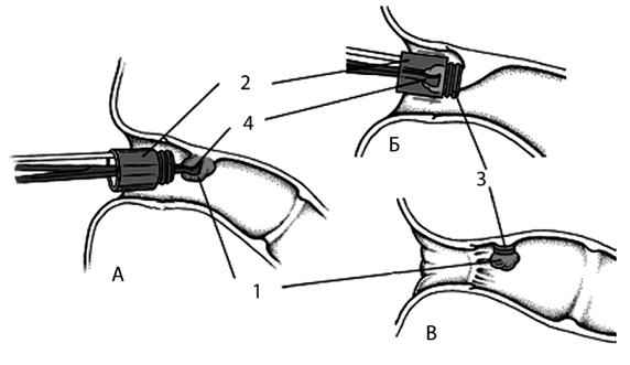 Рис. 200. Введение склерозанта в область сосудистой ножки геморроидального узла (по Blanchard) Терапевтический эффект заключается не в нарушении кровоснабжения геморроидальных узлов, как предполагалось ранее, а в их фиксации выше зубчатой линии. Преимущество склеротерапии в достаточно низком уровне послеоперационных осложнений. Основной недостаток, ограничивающий применение этой малоинвазивной методики – высокий уровень рецидивов – до 70 % через три года после терапии. Эффективным методом, особенно показанным при кровоточащем геморрое в I стадии, является инфракрасная коагуляция геморроидальных узлов. Лечебный эффект при этом основан на стимуляции некроза слизистой оболочки путем термокоагуляции. Методика лигирования увеличенных геморроидальных узлов (оптимально ее проведение при II стадии заболевания) с помощью резинового кольца, приводящая к их некрозу и отторжению, была предложена в 1958 г. Р. С. Blaisdell, а впоследствии просто усовершенствована и упрощена J. Barron (1963). В настоящее время данный метод лечения геморроя эффективно применяется многими проктологами (рис. 201). Оперативное лечение проводится у больных с III и IV стадией заболевания.