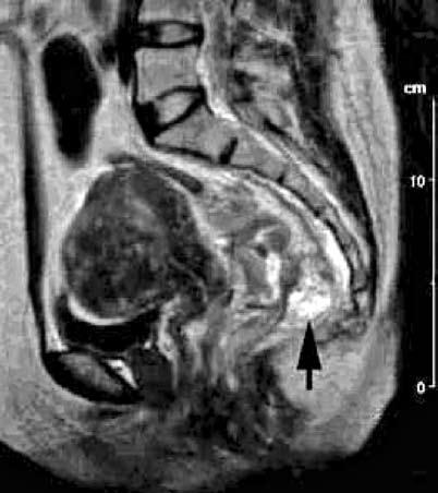 Рис. 212. Магнитно‑резонансная томография (аксиальная проекция). Рак среднеампулярного отдела прямой кишки. На снимке видна инвазия опухоли в мезоректум на значительном протяжении –13 мм (белая стрелка), черными стрелками отмечена собственная фасция прямой кишки