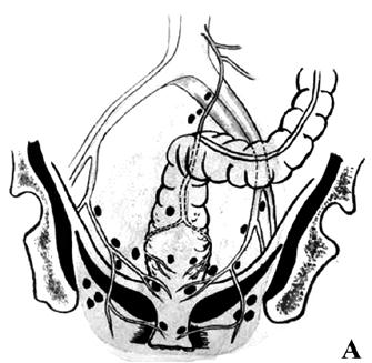 Рис. 208. Лимфатический отток от прямой кишки по Эрнесту Майлсу