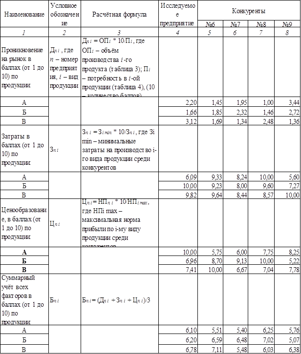 Вывод: согласно данным, отраженным в рисунке 1, по продукту А и Б самую высокую степень проникновения на рынок (степень удовлетворения спроса) имеет конкурент № 9; по продукту В - конкурент №8. Таким образом, ближайшим конкурентом для нашего предприятия является конкурент № 9.