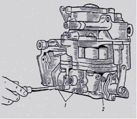 Основные неисправности приборов системы питания карбюраторного двигателя. Неисправности системы питания карбюраторных двигателей составляют около 10 % общего числа неисправностей двигателя. Внешними признаками неисправностей являются перебои или прекращение подачи топлива, перерасход топлива, "выстрелы" в глушителе, "вспышки" во впускном трубопроводе, перегрев и падение мощности двигателя. Основные неисправности всей системы: образование переобогащенной или обедненной горючей смеси из-за неисправности карбюратора топливного насоса, фильтров и топливопроводов. Неисправности устраняются регулировкой карбюратора, заменой неисправных прокладок и подтяжкой соединений, заменой изношенных или неисправных деталей. Особое внимание обращают на герметичность всех соединений и приборов. Подтекание топлива вызывает его потери и может привести к пожару на автобусе. Эксплуатация автобуса при негерметичности в соединениях системы питания или с неисправным глушителем категорически запрещена. Приемы выполнения работ при техническом обслуживании системы питания карбюраторного двигателя. Промывка карбюратора и очистка жиклеров производится чистым бензином или ацетоном с последующей продувкой сжатым воздухом. В карбюраторах К-135МУ и К-88А можно продуть жиклеры: главные, полной мощности, воздушные, холостого хода и клапан экономайзера через отверстия, закрытые резьбовыми пробками. При разборке карбюратора необходимо помнить, что нагнетательный клапан ускорительного насоса не закреплен и после снятия крышки поплавковой камеры может выпасть из корпуса. Не рекомендуется применять металлические предметы для чистки жиклеров, так как это приводит к их повреждению. Не следует продувать сжатым воздухом собранный карбюратор через топливоподводящие отверстия и балансировочную трубку, так как это может повредить сетчатый фильтр и поплавок. Топливные фильтры промывают при закрытом кране топливного бака. Вначале через сливное отверстие спускают отстой, а потом отстойник и фильтрующий элемент промывают чистым бензином. Фильтр тонкой очистки промывают ацетоном. При этом нельзя допускать погружения в ацетон резиновой прокладки фильтрующего элемента..Затем элемент продувают сжатым воздухом. Регулировку карбюраторов проводят для обеспечения устойчивой работы двигателя на холостом ходу при минимальном расходе топлива, Регулировка в значительной степени влияет на количество окиси углерода в отработавших газах. Перед регулировкой проверяют уровень топлива в поплавковой камере, полноту открытия воздушной заслонки, действие привода дроссельных заслонок. Система зажигания должна быть исправна, двигатель прогрет. Минимальные обороты регулируют упорным винтом 2 (рис. 3) и двумя винтами 1, изменяющими состав горючей смеси. Для проверки регулировки нажимают на педаль управления дроссельными заслонками и резко отпускают ее. Если двигатель перестанет работать, увеличивают частоту вращения коленчатого вала в режиме холостого хода. Периодически необходимо проверять присоединение тяги к рычагу дроссельных заслонок, полноту закрывания и открывания их, действие привода. Регулирование дроссельных заслонок производят следующим способом: отпустив винты, крепящие тросы в рычагах заслонок, устанавливают кнопки до упора в щиток, а зат