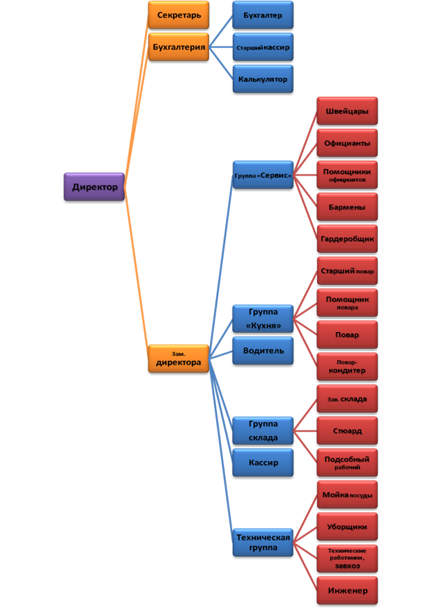 Внутренняя структура управления предприятия заключается в следующем: Во главе ресторанного предприятия стоит сам владелец. Работой с различного рода документами занимается личный секретарь руководителя предприятия. Непосредственно под контролем руководителя находится бухгалтерский отдел. Бухгалтерия является самой неотъемлемой частью для любого предприятия. Бухгалтерия ресторана включает в себя старшего бухгалтера, бухгалтера - кассира и бухгалтера - калькулятора. На бухгалтерской группе лежит огромная ответственность. Небольшая неточность в расчетах может привести к финансовому краху всего предприятия. Контроль над работой персонала осуществляется заместителем руководителя по персоналу. Этот человек контролирует работу всех штатных групп: сервисной, технической, кухонной и складской. В сервисную группу входят официанты, швейцары, гардеробщики и бармены. Техническая группа – это мойщики посуды, уборщики, завхоз. Во главе кухонной группы стоит старший повар, который руководит командой поваров и отчитывается о работе всей группы заместителю руководителя. Складская группа – это кладовщики и подсобные рабочие. Отдельно в организационную структуру (схема 1) заведения общественного питания входят кассиры и водители.