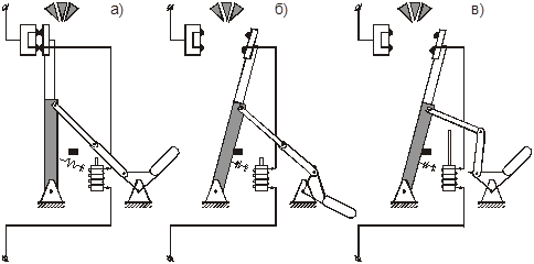 Рис. 1. Принцип работы автомата и его механизма свободного расцепления. Расцепители – элементы, контролирующие заданный параметр цепи и воздействующие через механизм свободного расцепления на отключение автомата при отклонении заданного параметра за установленные пределы. В зависимости от выполняемых функций защиты расцепители бывают: 1) токовый максимальный мгновенного или замедленного действия (используется как расцепитель перегрузки или селективный); 2) напряжения – минимальный, для отключения автомата при снижении напряжения ниже определенного уровня; 3) обратного тока – срабатывает при изменении направления тока; 4) тепловой – работает в зависимости от величины тока и времени его протекания (принимается обычно для защиты от перегрузок); 5) комбинированные – срабатывают при сочетании ряда факторов; Схема автомата с расцепителем токовым максимальным мгновенного действия показана на рис. 2а. Когда ток станет выше определенного значения, тяговое усилие электромагнита превысит усилие пружины, якорь притянется,механизм свободного расцепления освободится и выключатель отключится.