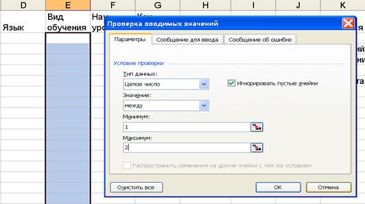 Рис.8 Сообщение для ввода и сообщение об ошибке Попробуйте ввести недопустимое значение (текстовое или выходящее за пределы заданного интервала) в ячейку столбца Е. Убедитесь, что это также невозможно. 8. Аналогичным образом задайте параметры проверки вводимых значений, сообщение для ввода и сообщение об ошибке для столбца F (начальный уровень обучения – целое число от 1 до 8). Текст сообщений придумайте сами. 9. Зададим параметры проверки вводимых значений, сообщение для ввода и сообщение об ошибке для столбца G (конечный уровень). При вводе данных введённое значение не должно быть меньше значения начального уровня в столбце F и больше 8: Выделите ячейку G2. Дайте команду Данные ►Проверка. В поле Тип данных выберите вариант Целое число. В полях Минимум и Максимум укажите, соответственно, значения =F2 и 8 (см. рис.9). Задайте сообщение для ввода и сообщение об ошибке. Текст сообщений придумайте сами.