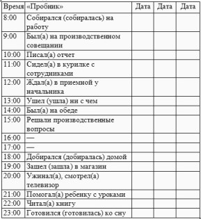Итак, работа с графиком. Для начала сядьте этим вечером за стол и заполните первый столбец из приведенной таблицы — «Пробник». Просто запишите все дела, которые вы на протяжении этого дня предприняли. Записывайте абсолютно все, что можно хоть как-то назвать или обозначить. Вероятно, анализируя эти данные, вы сможете сказать, что в течение этого дня у вас неоднократно возникали провалы активности, т.е. своеобразные лакуны времени, ничем, никакой деятельностью не заполненные. Теперь подумайте о том. какие дела можно втиснуть в завтрашний день. И запомните, что сейчас следует придерживаться правила: чем меньше дело, чем менее оно серьезно, тем лучше. Составьте график таким образом, чтобы лакун в нем не было, чтобы на каждое пустое времяпрепровождение у вас приходилось какое-нибудь незначительное, но занятие. Помните — это ваш план на завтрашний день, необходимо, чтобы он постоянно был у вас под руками и выполнялся. Важно, конечно, не точное соответствие плану, а то, чтобы в нем не возникали пустоты. В завершение сказанного я должен оговориться. Дело делу, как известно, рознь. Вы и сами знаете, что можете чем-то заниматься, но при этом думать совершенно о другом, в частности, «гонять» свои депрессивные мысли — слева направо и справа налево. Так дело не пойдет, старайтесь полностью переключаться на ту деятельность, которую вы осуществляете. Пытайтесь подойти к любому делу, пусть и самому пустяшному, как можно более обстоятельно. Чем бы вы ни занимались, подходите к этому, как к священному ритуалу — «с чувством, с толком, с расстановкой». Если вы просто едите, делайте это так, словно бы участвуете в японской чайной церемонии. Если вы просто едете в общественном транспорте, займите себя чтением или банальным разглядыванием. Если вы разговариваете с кем-то, то старайтесь быть внимательными, вникнуть в суть адресованного вам сообщения. Возможно, это сообщение и не блещет оригинальностью, но здесь-то важно не то, насколько оно важно, а то, насколько вы увлечены этим делом.