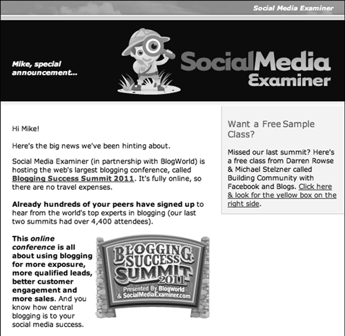 Привет, Майк! У нас отличные новости! Social Media Examiner (совместно с BlogWorld) проводит самую большую в Сети конференцию Blogging Success Summit 2011. Она проходит онлайн, так что никаких расходов на дорогу. Сотни компаний уже подписались на участие в ней и услышат самых крупных экспертов в мире блогинга (на наших последних двух саммитах было зарегистрировано более 4400 участников). Эта онлайн‑конференция расскажет о том, как использовать блогинг для расширения бизнеса, привлечения подходящих клиентов, вовлечения покупателей и увеличения объема продаж. Хотите бесплатный образец урока? Вы пропустили прошлый саммит? Вот бесплатный урок от Даррена Роуза и Майкла Стелзнера на тему «Как организовать сообщество, используя Facebook и блоги»