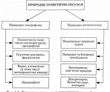 Природні рекреаційні ресурси - це обєкти і явища натурального походження,залучені у сферу рекреації і туризму. Їх життєвий цикл може бути надтривалим, тривалим, короткотривалим,епізодичним; у просторі - планетарними, зональними, азональними, дискретними, континуальними, унікальними, за конфігурацією - площинними, лінійними, точковими. Природно-антропогеннi ресурси становлять ділянки суші і водного простору, природні комплекси та об'єкти яких мають особливу рекреаційну, наукову, естетичну, природоохоронну та іншу цінність і виділені з метою збереження природної різноманітності ландшафтів, генофонду тваринного і рослинного світу, підтримання загального екологічного балансу та забезпечення фонового моніторингу навколишнього природного середовища. До природно-антропогенних ресурсів відносять: а) природні території та об'єкти (природнього походження) - національні природні і регіональні ландшафтні парки, природні та біосферні заповідники(заповідні урочища), заказники, пам'ятники природи. б) штучно створені об'єкти(антропогенного походження) - парки-пам'ятники садово-паркового мистецтва. ботанічні сади, дендрологічні і зоологічні парки, печерні міста, лісопарки, гідропарки, лугопарки.(рис.1) Природно-антропогеннi території та об'єкти можуть використовуватися в природоохоронних, науково-дослідних, освітньо-виховних, оздоровчих та інших рекреаційних цілях; для потреб моніторингу навколишнього природного середовища. Режим територій та об'єктів природно-заповідного фонду - це сукупність науково обґрунтованих екологічних вимог, норм і правил, які визначають правовий статус, призначення цих територій та об'єктів, характер допустимої діяльності в них, порядок охорони, використання і відтворення їх природних комплексів. Заслуговує на увагу правовий режим територій та об'єктів природно-заповідного фонду України Гіперблок рекреаційно-туристичних ресурсів складається з природних, природно-антропогенних, суспільно-історичних
