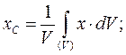 Аналогічно визначаються координати центру ваги об’ємного тіла з вирізами. 4. Метод інтегрування. Якщо тіло не можна розбити на частини, положення центрів ваги яких відоме, то тіло розбивають на елементарні об’єми. У такому випадку координати центру ваги визначають за формулами: