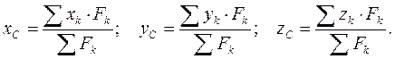 Спроектуємо вектори лівої та правої частин цього рівняння на вісі координат хуz та одержимо формули для обчислення координат центру паралельних сил: