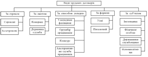Трудові договори відрізняються між собою різними критеріями. Треба зазначити, що трудові договори можуть одночасно відрізнятися між собою і формою, і строком, і змістом, і суб' єктом (наприклад, контракт). Варто врахувати, що трудове законодавство не поширюється на відносини щодо проходження служби в органах Міністерства внутрішніх справ України та проходження служби військовослужбовцями. Зауважимо, що умови трудових договорів членів кооперативів та їх об'єднань, працівників підприємств з іноземними інвестиціями та деяких інших категорій працівників визначаються законодавством та їх статутами. При цьому гарантії щодо зайнятості, охорони праці, праці жінок, молоді, інвалідів надаються в порядку, передбаченому законодавством про працю. Трудові договори з іноземними громадянами, які працюють на підприємствах, в установах, організаціях України, регулюються законодавством України та міжнародними договорами України. Розглянемо особливості окремих видів трудових договорів. Строкові трудові договори. Трудовий договір може бути безстроковим, що укладається на невизначений строк, і строковим. Більшість трудових договорів укладається на невизначений строк. З таким договором пов'язана постійна робота, не обмежена певним строком. Умова щодо строку трудового договору визначається угодою його сторін. У наказі (розпорядженні) про прийняття на роботу зазначається строк трудового договору. До початку роботи за укладеним трудовим договором роботодавець зобов'язаний роз'яснити працівникові його права і обов'язки та поінформувати під розписку про умови праці, строковий характер роботи. У трудовій книжці при прийнятті на роботу запис про строковий характер роботи не робиться. Строкові трудові договори не є типовими і укладаються: • у випадках, коли трудові відносини не можуть бути встановлені на невизначений строк з урахуванням характеру подальшої роботи, або умов її виконання, або інтересів працівника; • в інших випадках, передбачених законодавчими актами. Строковий трудовий договір укладається на визначений строк, встановлений за погодженням сторін та на час виконання певної роботи (ст. 23 КЗпП). При укладенні трудового договору на визначений строк цей строк встановлюється погодженням сторін і може визначатись як конкретним строком, так і часом настання певної події (наприклад, повернення на роботу працівниці з відпустки по вагітності, пологах і догляду за дитиною; особи, яка звільнилась з роботи у зв'язку з призовом на дійсну строкову військову чи альтернативну службу, обранням народним депутатом чи на виборну посаду (або виконанням певного обсягу робіт).