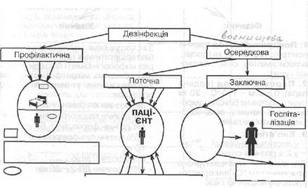 а) кип'ятіння в 2% розчині соди — 15 хв; б) замочування в 6% розчині перекису водню — 1 год; в) замочування в 3% розчині хлораміну — 1 год; г) засипання суким хлорним вапном на 1 год. а) крові; б) залишкової кількості дезінфекційних розчинів; ■ в) жиру; г) залишкової кількості мийних засобів. Для запобігання виникненню ВЛІ в лікарні постійно проводять таку дезінфекцію: а) осередкову; б) заключну; '': в) поточну; г) профілактичну. 7. До хімічних методів дезінфекції належать: а) ультрафіолетове опромінення; б) використання хлорвмісних речовин; ; в) кип'ятіння; г) обробка паром. 8. До фізичних методів дезінфекції належать: а) використання хлорвмісних речовин; б) кип'ятіння; г) використання 70% спирту етилового; д) використання мийних розчинів. 9. Вкажіть послідовність етапів деконтамінації: а) передстерилізаційне очищення; б) стерилізація; в) очищення; з#-> г) дезінфекція. "^ 10. Поточна дезінфекція має на меті: а) запобігання виникненню ВЛІ; б) знищення збудника хвороби в осередку інфекції у в) знищення збудника хвороби після видалення джерела г) знищення збудника інфекції в осередку. ', \ V. ПЛАН ПРОВЕДЕННЯ ЗАНЯТТЯ 1. Дайте визначення поняттю "санітарно-протиепідемічний режим ЛПУ", використовуючи графологічну структуру теми (схема 1). Групи ризику щодо захворювання на ВІЛ: —пацієнти, інфіковані в стаціонарі; —пацієнти, які отримують поліклінічну, швидку (невідкладну) —медичні працівники, що надають невідкладної або планової Схема 1. Профілактика ВЛІ