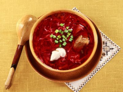 Інструкційна картка На страву: «Борщ український» Підстава: В.С. Доцяк «Українська кухня», ст. 186 Мета: Навчитися готувати страву «Борщ український», з дотриманням якості в роботі, технологічних норм, правил техніки безпеки та вимог санітарії і гігієни. Обладнання, інвентар: обробна дошка, кухарська трійка ножів, електрична плита, виробничий стіл, ложка, шумівка, сковорода, жарова шафа. Сировина: буряк, капуста, картопля, морква, петрушка, цибуля, часник, томатне-пюре, борошно, сало, жир, цукор, оцет, перець солодкий, дріжджі, олія, яйця. Послідовність виконання робіт 1. Підготовлене м'ясо, кістки, відварити. 2. Бульйон процідити. 3. Нарізати буряк соломкою, додати оцет, жир, томат-пюре, додати бульйон, тушкувати до напівготовності 1-1,5 год. 4. Цибулю, моркву петрушку шаткують соломкою і пасерують з жиром. 5. М'ясо-кістковий бульйон процідити, довести до кипіння. 6. Закласти в киплячий бульйон картоплю нарізану часточками, довести до готовності. 7. Додати нашатковану капусту варити 10-15 хв. 8. Додати тушковані буряки, пасеровані овочі. 9. За 5-10хв. до закінчення варіння кладуть солодкий перець нарізаний соломкою, пасероване розведене бульйоном борошно, сіль, цукор, спеції. 10. Готовий борщ заправити салом шпик, розтертим з часником, настояти - 20хв. 11. Відпустити у підігрітій великій тарілці, покласти кусочок мяса, налити борщ, покласти сметану. 12. Приготування пампушок 13. Готуємо дріжджове тісто безопарним способом: 14. У теплу воду додати розчинені і проціджені дріжджі, цукор, сіль, просіяне борошно. 15. Добре вимісити до однорідної консистенції. 16. Тісто поставити в тепле місце для бродіння на 3,5-4год., періодично обминають для бродіння. 17. З підготовленого тіста формують кульки масою 30г, щільно укласти на змащений жиром лист, щоб воно підійшло. 18. Змастити яйцем і випікати 7-8хв. Приготування часникової підливи: Часник розтерти з сіллю, додати олію і переварену охолоджену воду. Набір сировини на 1 порцію