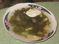 Інструкційна картка На страву: «Щі зелені» Підстава: «Збірник рецептур» № 186 Мета: Навчитися готувати страву «Щі зелені»,з дотриманням якості в роботі, технологічних норм, правил техніки безпеки та вимог санітарії і гігієни. Обладнання, інвентар: обробна дошка, кухарська трійка ножів, електрична плита, виробничий стіл, ложка, шумівка, сковорода. Сировина: щавель, шпинат, картопля, петрушка, цибуля ріпчаста, цибуля зелена, борошно пшеничне, маргарин, яйця, бульйон або вода. Послідовність виконання робіт 1. Щавель припустити у власному соку. 2. Шпінат пропустити в невеликій кількості води. 3. Протерти. 4. В кип'ячий бульйон або воду покласти картоплю, варити. 5. Додати пасеровану ріпчасту цибулю, пюре із щавля і шпинату. 6. Варити 15 хв. 7. За 5-10 хв. до закінчення варіння щі заправляють пасерованим борошном, розведеним у бульйоні або воді. 8. Додати сіль, спеції. Набір сировини на 1 порцію
