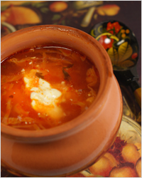 На страву: «Борщ полтавський» Підстава: В.С. Доцяк «Українська кухня», ст. 186 Мета: Навчитися готувати страву «Борщ полтавський», з дотриманням якості в роботі, технологічних норм, правил техніки безпеки та вимог санітарії і гігієни. Обладнання, інвентар: обробна дошка, кухарська трійка ножів, електрична плита, виробничий стіл, ложка, шумівка, сковорода, жарова шафа. Сировина: буряк, капуста, картопля, морква, петрушка, цибуля, томатне-пюре, борошно, сало, жир, цукор, оцет, перець солодкий, дріжджі, олія, яйця. Послідовність виконання робіт 1. Відварити бульйон з курки. 2. Нарізати буряк скибочками, додати оцет, жир, томат-пюре, додати бульйон, тушкувати до готовності. 3. Моркву, петрушку нарізати скибочками. 4. Цибулю півкільцями і пасерують з додаванням томатне-пюре. 5. Закласти в проціджений бульйон картоплю нарізану кубиками, довести до готовності. 6. Додати капусту нарізану шашками, варити 10-15 хв. 7. Додати тушковані буряки, пасеровані овочі, спеції 8. Варити до готовності. 9. Готовий борщ заправити салом шпик, розтертим з ріпчастою цибулею, настояти 20 хв. 10. Відпустити у підігрітій великій тарілці, покласти шматок курки, галушки, налити борщ, покласти сметану й посипають дрібно нарізаною зеленню петрушки або кропу. Приготування галушок: 1. У кип'ячу підсолену воду додати третину борошна, добре вимішати і охолодити. 2. Додати решту борошна,яйця і замісити некруте тісто, яке набирають столовою ложкою, опускають у підсолену воду, варити до готовності 3. Тісто можна розкачати шаром 4-5 мм завтовшки, нарізати квадратиками, і варити до готовності в підсоленій киплячій воді. Набір сировини на 1 порцію
